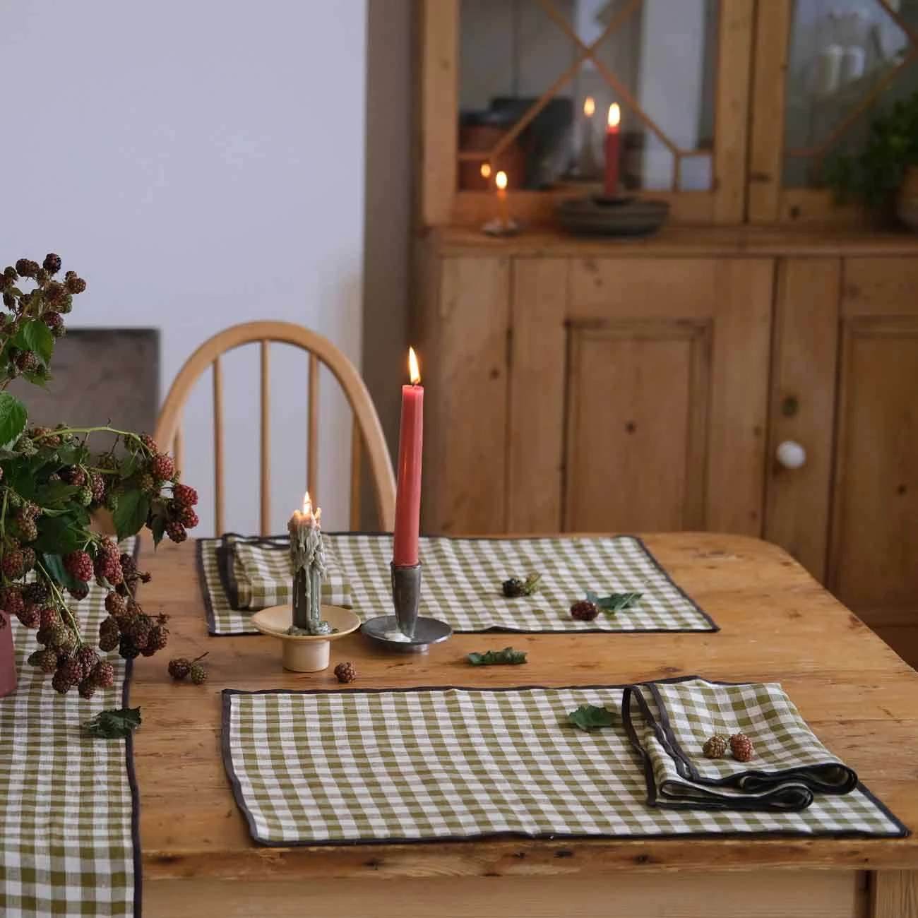 Made in Portugal, our Gingham Linen Set of Placemats consists of four beautifully crafted placemats, made from 100% stonewashed European linen. Shown here in our Botanical Green shade, boldly embellished with a black overlocked border. Complete your gingham tableware set with the rest of our range, including napkins, runners and tablecloths.