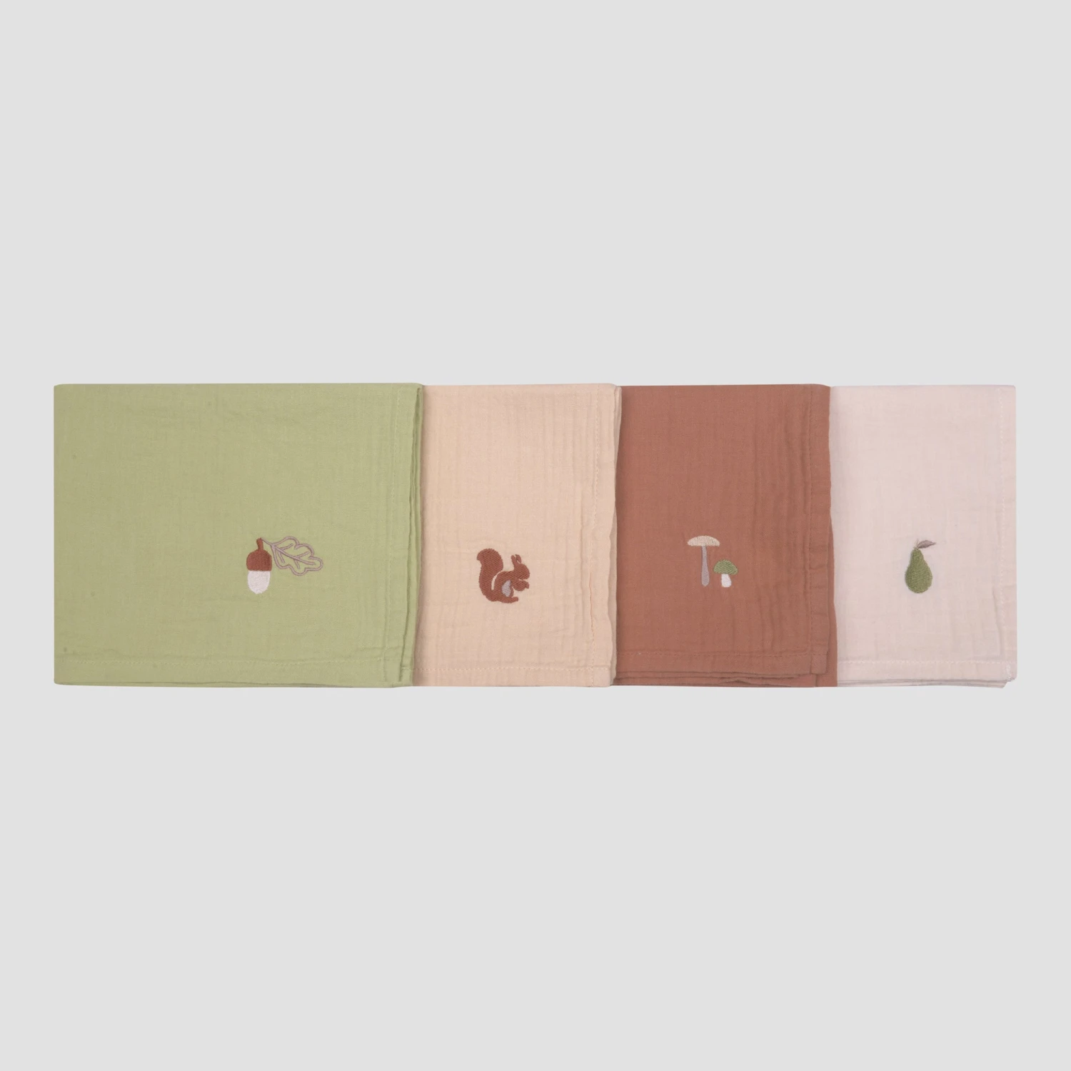 Our Cotton Gauze Muslin Squares are a nursery and nappy bag must-have. Made from 100% cotton, they’re soft, breathable and absorbent – perfect for catching drips, dribbles and spills, or as an extra blanket for warmth. Our muslin squares come in a set of four beautiful colourways (Chestnut, Chalk, Sweatpea and Buttercup), each with an embroidered woodland motif.