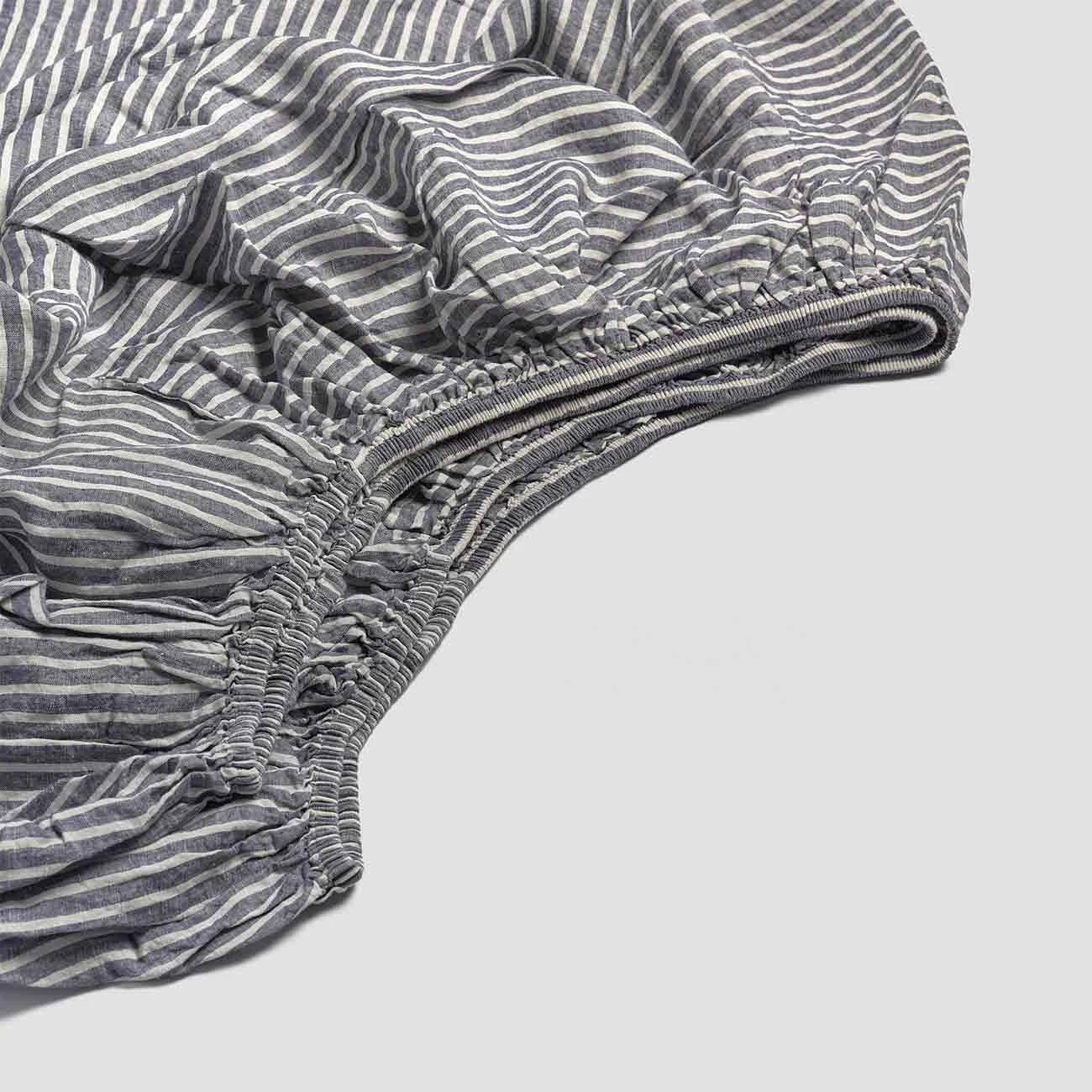 - Midnight Stripe linen fitted sheet with elasticated edges to make bed making easier