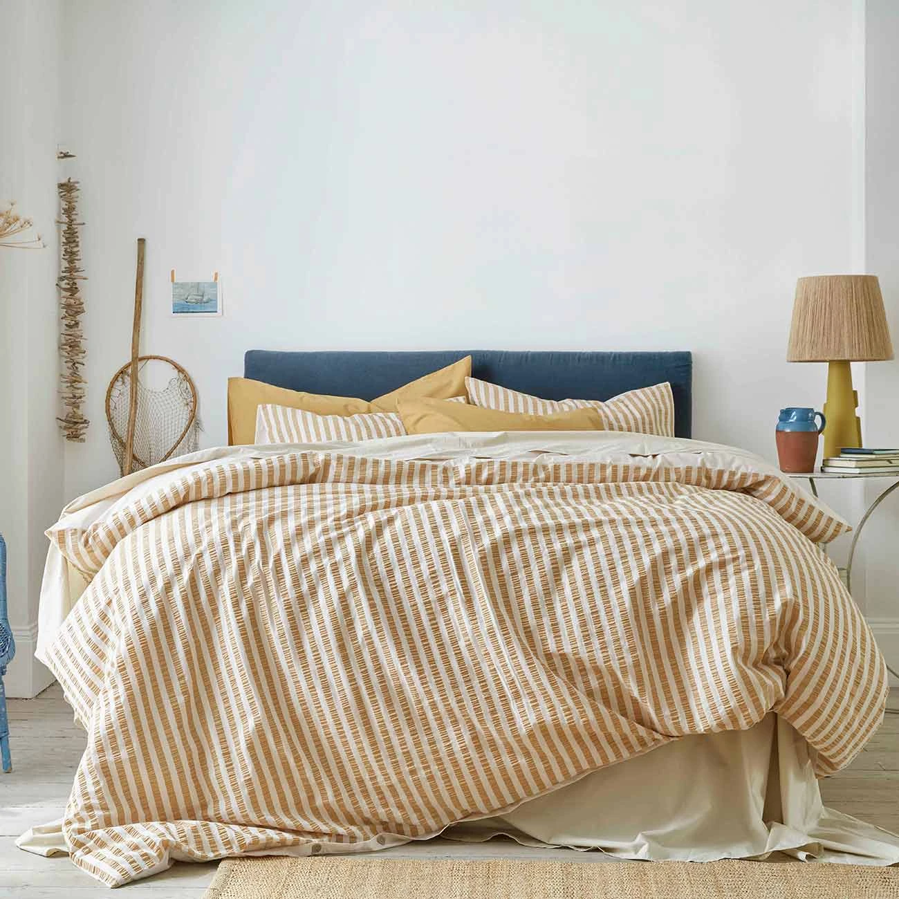 Inspired by the nostalgia of childhood holidays spent on the British coast, our Ochre Seersucker Stripe Cotton Bundle features an alternate stripe of Parchment and Ochre: a warm and earthy shade of yellow. Made in Portugal from sustainably-sourced cotton, our seersucker stripe cotton bedding is achieved by weaving yarns of different tensions to create a relaxed, puckered effect, allowing for a breathable, cool and comfortable sleep. If you are looking to mix and match our Ochre Seersucker Stripe range, our plain washed cotton styles: Pear, Cove Blue or Mulberry make for a charming bedding ensemble.