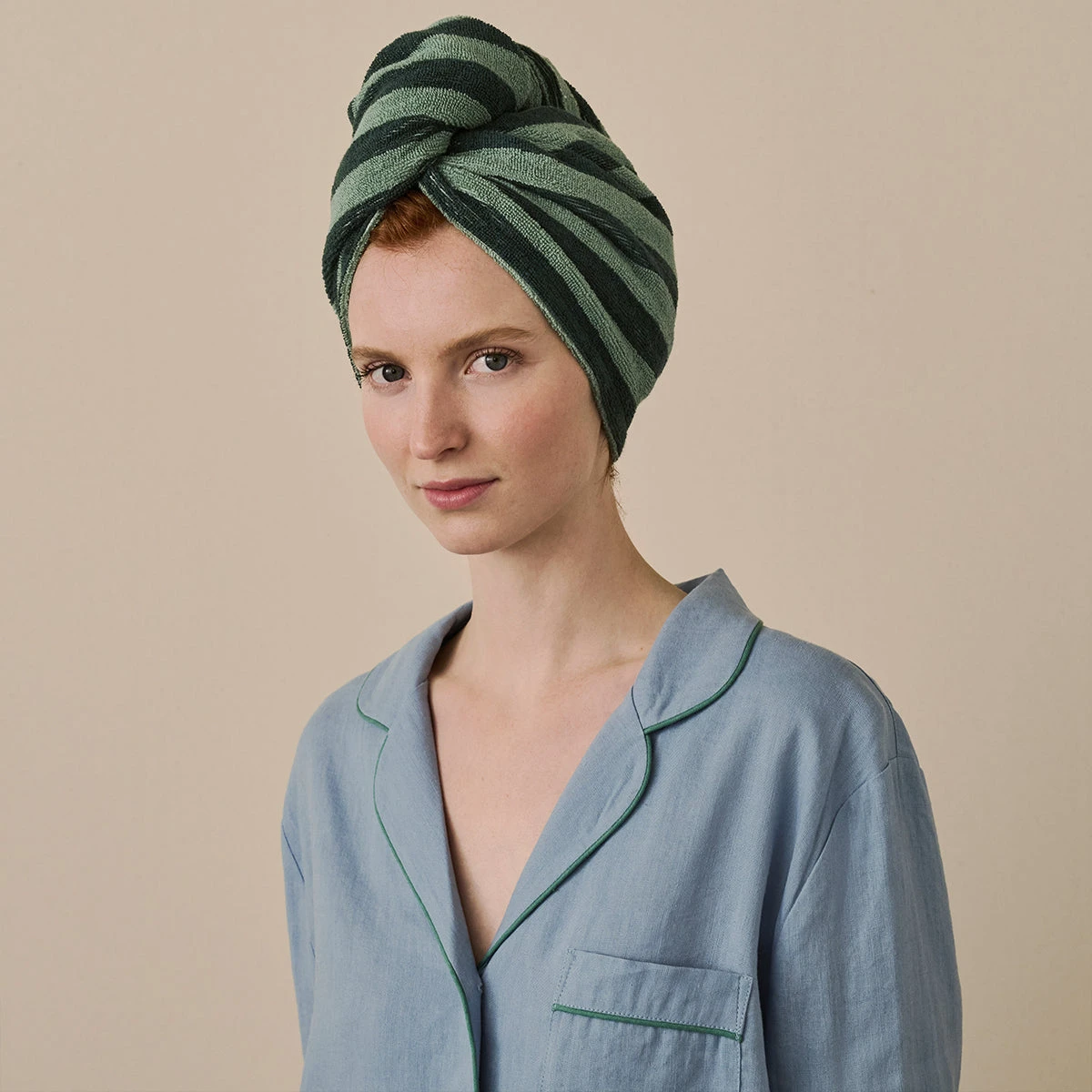 Our Pine Green Pembroke Stripe Cotton Hair Towel is a haircare must-have for your post-shower routine. The super soft and absorbent fabric will soak up excess moisture to cut down on drying time, and it’s perfect for keeping your pillow clean when indulging in an overnight hair mask. Our hair towels feature a handy elasticated loop and corozo button for easy fastening.