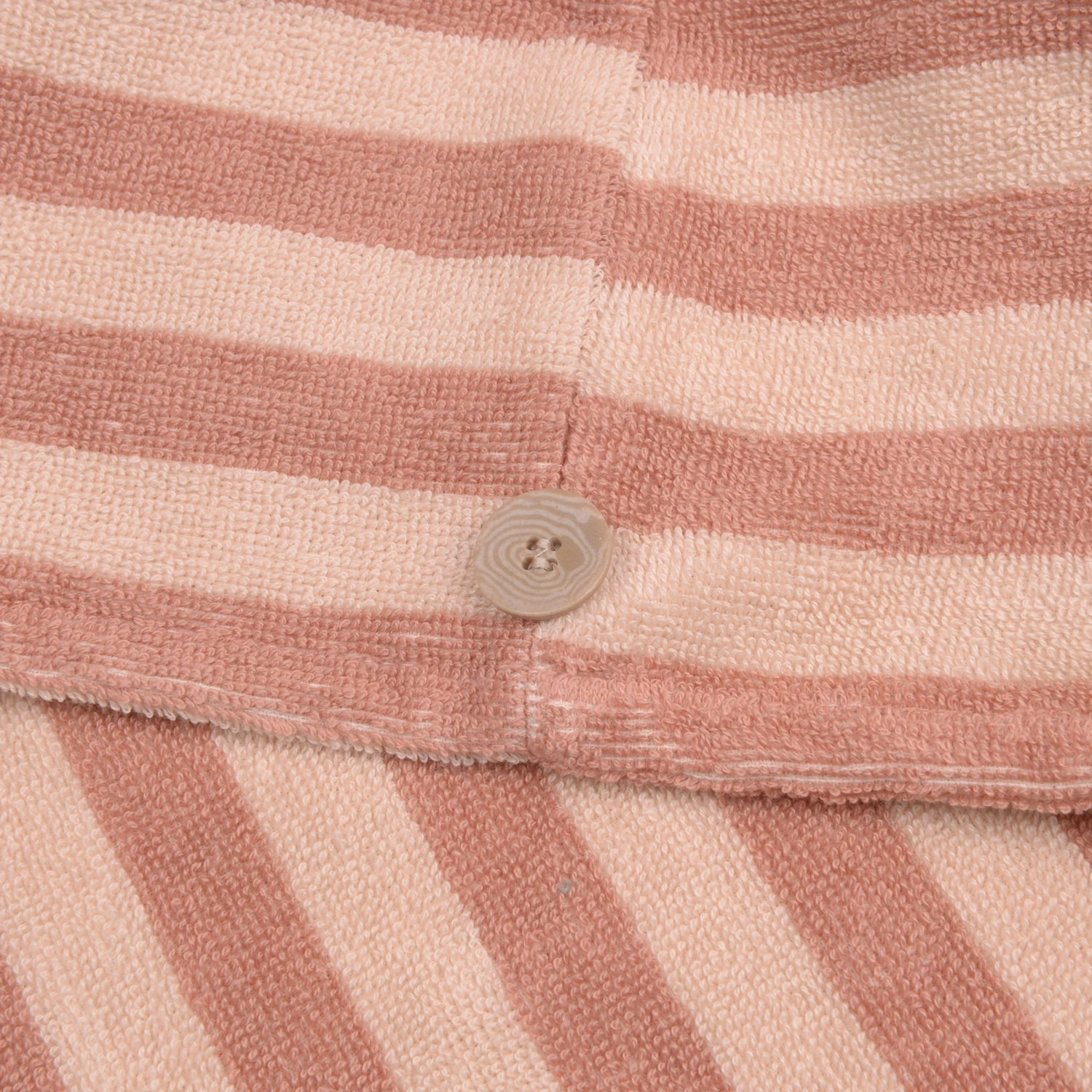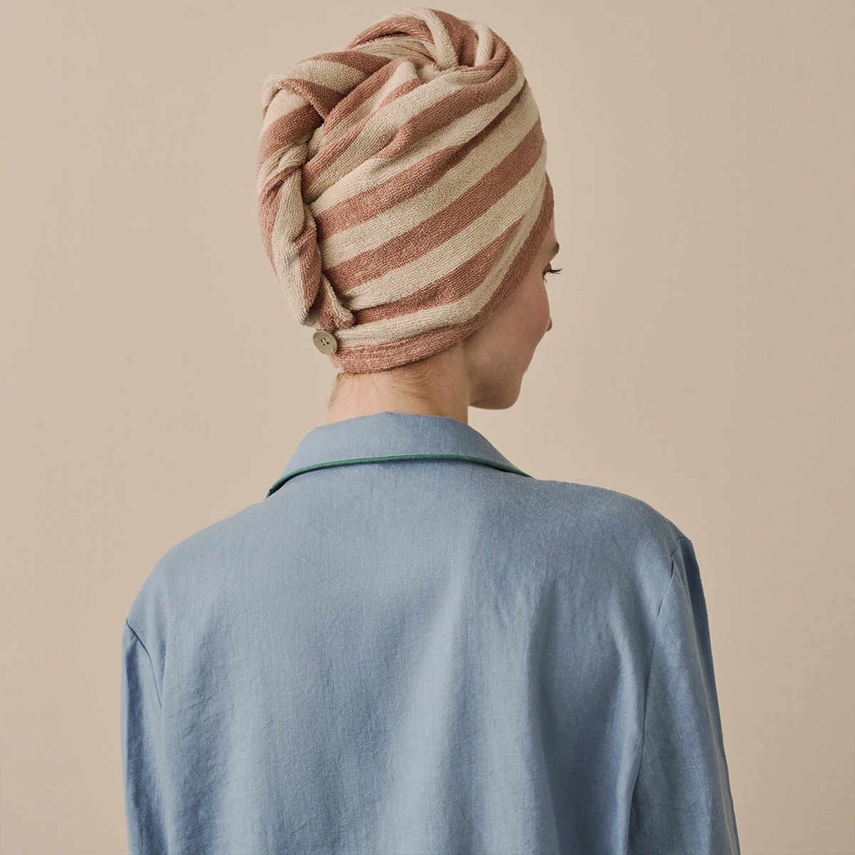 Our Sand Shell Pembroke Stripe Cotton Hair Towel is a haircare must-have for your post-shower routine. The super soft and absorbent fabric will soak up excess moisture to cut down on drying time, and it’s perfect for keeping your pillow clean when indulging in an overnight hair mask. Our hair towels feature a handy elasticated loop and corozo button for easy fastening.